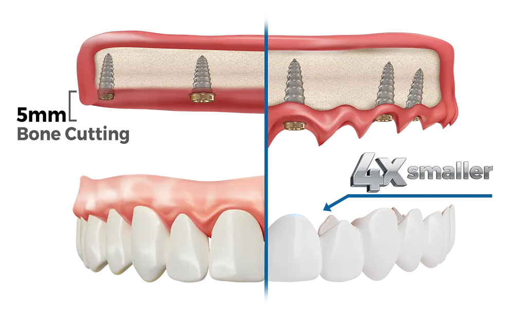 Standard All-on-4 implants often require removing up to 5mm of your natural bone to make room for bulky artificial gums.